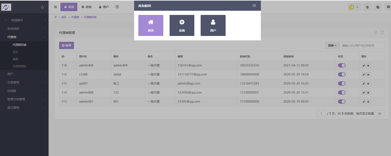 本系统为**专为互联网金融企业设计的股票配资SaaS平台**,采用ThinkPHP5.1框架开发,前端基于Vue.js+ElementUI实现响应式布局,完美适配手机浏览器与微信端。系统集成证券模拟交易引擎、实时风险率计算、自动平仓预警等核心功能,支持**融资融券双业务模式**,满足合规化场外配资场景需求。